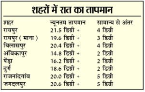 रायपुर में सोमवार को दिन और रात का तापमान सामान्य से ऊपर रहा। यहां न्यूनतम तापमान 21.5 डिग्री रहा। दिन का तापमान 33.6 डिग्री रिकॉर्ड किया गया, जो औसत तापमान से 2 डिग्री ज्यादा था। रात का तापमान भी औसत तापमान से 4 डिग्री ज्यादा रहा।