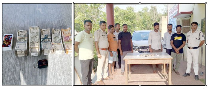 गिरफ्तार आरोपी गणेशराम बघेल पिता महादेव प्रसाद बघेल उम्र 40 साल साकिन गिरसा थाना सरसीवा, अंतराम साहू पिता करमसिंह साहू उम्र 33 वर्ष साकिन खम्हरिया थाना सरसीवा, लाला श्रीवास पिता स्व. लक्ष्मण श्रीवास उम्र 33 वर्ष साकिन गिरसा थाना सरसीवां, दिनेशकुमार साहू पिता बिरीछराम साहू उम्र 34 वर्ष साकिन चांटीपाली थाना डभरा जिला सक्ती, राजेन्द्र जायसवाल पिता हुलास जायसवाल उम्र 23 साल साकिन छपोरा थाना माल खरौदा जिला सक्ती, मदन साहू पिता गणेशराम साहू उम्र 26 वर्ष साकिन छपोरा जिला सक्ती आरोपी के पास से जप्ती 52 पत्ती ताश नगद रकम 2 लाख 9 हजार रूपये एक चटाई, एक कार एक्सएल-6 सीजी 11 बीएम 5347 कीमत 15 लाख रु. का जप्त किया गया। आरोपियो का कृत्य अपराध धारा 3(2) छ.ग. जुआ अधि. 2022 अंतर्गत होने के कारण आरोपियों को गिरफ्तार कर विधिवत कार्यवाही की गयी। उक्त कार्यवाही में थाना प्रभारी टीकाराम खटकर के हमराह में प्रआर आनंद निराला, आर गौशीशंकर भारद्वाज, प्रकाश भारद्वाज, धनंजय खाण्डेकर का विशेष योगदान रहा है।