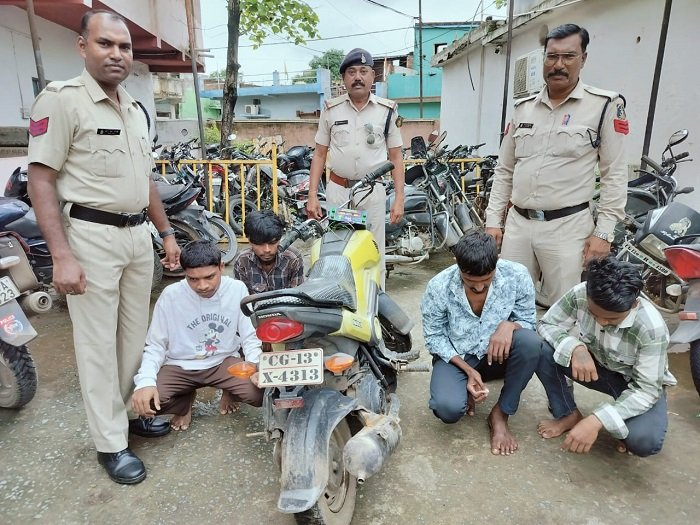 ऐसे में जुटमिल थाना प्रभारी मोहन भारद्धाज द्वारा बाइक का डिटेल निकाल कर आसपास लगे सीसीटीवी फुटेज जांच किया तो बजरंग पारा के अजय मेहर तथा राजीव गांधी नगर के लडक़ों के शामिल होने की जानकारी मिली। जिससे तत्काल छापेमारी कर आरोपियों को पकड़ा गया। जिसमें आरोपी अजय मेहर पिता साधुराम मेहर 23 साल निवासी निगम कॉलोनी बजरंग पारा, उमेश उर्फ भानु पिता शौकीलाल चौहान 21 साल, हीराधर सिदार पिता छबिलाल सिदार 19 साल तथा पंकज रिंटू चौहान पिता अमर चौहान 19 साल तीनों निवासी राजीव गांधी नगर मि_ूमुडा थाना जूटमिल को हिरासत में लेकर चोरी के संबंध में पूछताछ करने उसने बताया कि 24 जुलाई की रात ट्रांसपोर्ट नगर स्थित महावीर ट्रांसपोर्ट के सामने खड़ी ट्रक का गेट को तोडकऱ एक साउंड सिस्टम और 6000 रुपए को थैला सहित चुराए लिए और 1500-1500 रुपए चारों आपस में बांट लिए थे। जिसको खर्च कर चुके हैं। साथ ही आरोपी उमेश उर्फ बानू चौहान के पास से चोरी के साउंड सिस्टम तथा आरोपी पंकज उर्फ रिंटू चौहान से घटना में प्रयुक्त मोटरसाइकिल सीजी 13 एक्स 4313 जब्त कर आरोपियों की संख्या एक से अधिक होने पर धारा 3(5) भारतीय न्याय संहिता कर रिमांड पर भेजा गया है।