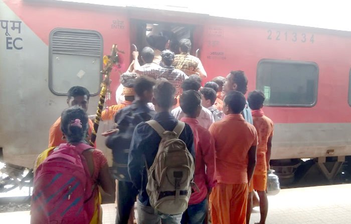 रायगढ़। श्रावण मास के चौथे व अंतिम सोमवारी को लेकर रविवार को रेलवे स्टेशन में सुबह से ही कावंडिय़ों की भारी भीड़ लगी हुई थी। जिससे पूरा स्टेशन भगवामय हो गया था। इस दौरान ट्रेन आते ही बोल बम के नारे के साथ कांवडिय़ों का हुजुम ट्रेन में चढऩे के लिए टूट पड़ रहे थे, जिससे ट्रेन के एसी बोगी से लेकर स्लीपर तक में जनरल बोगी की तरह नजर आ रहा था।