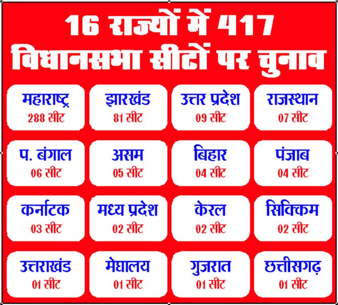 लोकसभा सीटों में केरल की वायनाड में 13 नवंबर और महाराष्ट्र के नांदेड़ में 20 नवंबर को वोटिंग होगी। वहीं, 47 विधानसभा सीटों पर 13 नवंबर को और उत्तराखंड की केदारनाथ विधानसभा सीट पर 20 नवंबर को मतदान होगा। सभी के नतीजे 23 नवंबर को आएंगे।