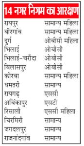 रायपुर। प्रदेश के 14 नगर निगम में मेयर, 54 नगर पालिका और 124 नगर पंचायत में अध्यक्ष के आरक्षण की प्रकिया पूरी हो गई। कुल 192 नगरीय निकाय के लिए आरक्षण किया गया है। इस बार 5 नगर निगमों में महिला मेयर चुनीं जाएंगी। रायपुर से सामान्य वर्ग की महिला मेयर चुनाव लड़ेगी। 54 नगर पालिका में 18 सीट महिला के लिए आरक्षित की गई है। इनमें 3 एससी, 2 एसटी, 4 ओबीसी और 9 सीट सामान्य वर्ग की महिला चुनाव लड़ेगी।