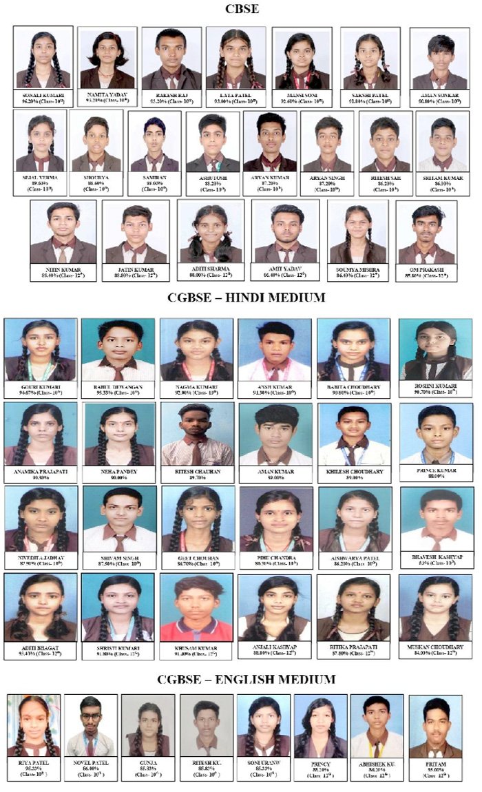 12वीं सी.बी.एस.ई. में नितिन श्रीवास नें 89.5 प्रतिशत, 10वीं में सोनाली कु. 96.20 प्रतिशत, सी. जी. बोर्ड अंग्रेजी माध्यम 12वीं में प्रिन्सी श्रीवास्तव 88.20 प्रतिशत, 10वीं में रिया पटेल 95.33 प्रतिशत, सी.जी. बोर्ड हिन्दी माध्यम 12वीं में अदिती भगत नें 93.40 प्रतिशत, 10वीं में गौरी कुमारी 96.70 प्रतिशत अंक प्राप्त कर उच्चतम स्थान प्राप्त किये। सी.जी. बोर्ड अंग्रेजी एवं हिन्दी माध्यम के आठवीं एवं पांचवीं की केन्द्रीकृत परीक्षा परिणाम शत्-प्रतिषत रहा। अधिकांश छात्र ए+ एवं ए ग्रेड प्राप्त कर उत्तीर्ण रहे। इस शानदार परीक्षा परिणाम के लिए छात्रों एवं शिक्षकों को संचालन समिति के चेयरमेन श्री विजय कुमार अग्रवाल सहित समस्त पदाधिकारियों एवं तीनों प्राचार्य ने बधाई एवं छात्रों के उज्जवल भविष्य की कामना प्रेषित की है।