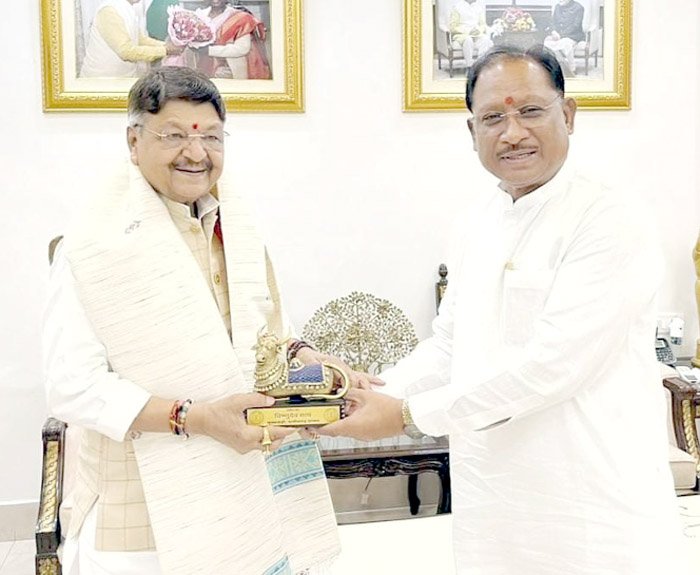 रायपुर। मुख्यमंत्री विष्णु देव साय से आज उनके निवास कार्यालय में मध्यप्रदेश शासन के शहरी विकास मंत्री श्री कैलाश विजयवर्गीय ने सौजन्य मुलाकात की। इस दौरान दोनों नेताओं के बीच राज्य एवं क्षेत्रीय विकास से जुड़े विविध विषयों पर चर्चा हुई। मुख्यमंत्री श्री साय ने श्री विजयवर्गीय का आत्मीय स्वागत किया तथा उन्हें छत्तीसगढ़ की पारंपरिक संस्कृति का प्रतीक शॉल एवं नंदी भेंटकर सम्मानित किया। इस अवसर पर छत्तीसगढ़ राज्य नागरिक आपूर्ति निगम के अध्यक्ष श्री संजय श्रीवास्तव और छत्तीसगढ़ वक्फ बोर्ड के चेयरमैन डॉ. सलीम राज भी उपस्थित थे।