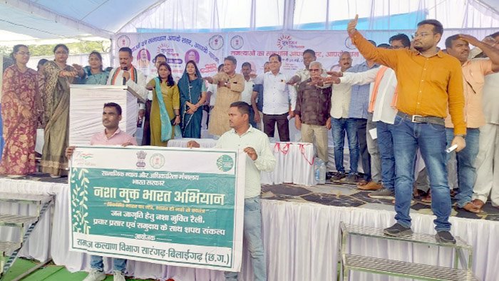 सारंगढ़। छत्तीसगढ़ शासन समाज कल्याण विभाग सारंगढ़ बिलाईगढ़ द्वारा कलेक्टर डॉ. संजय कन्नौजे के निर्देशन में चलाए जा रहे नशा मुक्ति संबंधी जन जागृति अभियान के अंतर्गत आज जिले के बिलाईगढ़ विकास खंड के ग्राम पंचायत जोगेसरा में आयोजित सुशासन तिहार शिविर में नशा मुक्त समाज निर्माण के लिए अध्यक्ष जिला पंचायत संजय भूषण पांडेय ने उपस्थित जन प्रतिनिधियों, अधिकारी कर्मचारी एवं नागरिकों को शपथ संकल्प दिलाया। इस अवसर पर जिला भाजपा अध्यक्ष ज्योति पटेल, जिला पंचायत सदस्य श्रीमती साहू, एस डी एम डॉ वर्षा बंसल, तहसीलदार आयुष तिवारी,जनपद सीईओ प्रतीक प्रधान,स्थानीय जनपद सदस्य, सरपंच, पंच, अनेक दिव्यांगजन, भारत माता वाहिनी समूह की महिलाएं सहित अन्य जनप्रतिनिधि विशेष रूप से उपस्थित रहे।