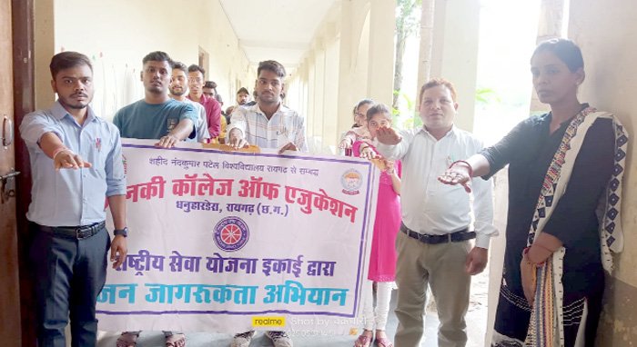 रायगढ़। शहीद नंदकुमार पटेल विश्वविद्यालय रायगढ़ से संबद्ध जानकी कॉलेज ऑफ एजुकेशन धनुहारडेरा रायगढ़ के राष्ट्रीय सेवा योजना इकाई द्वारा शहीद नंदकुमार पटेल विश्वविद्यालय रायगढ़ रासेयो प्रकोष्ठ के दिशा निर्देशानुसार तथा जानकी कॉलेज ऑफ एजुकेशन के चेयरमैन शिरीष सारडा डायरेक्टर श्रीमती तृप्ति अग्रवाल के संरक्षण, प्राचार्य डॉ गजेंद्र चक्रधारी के मार्गदर्शन एवं कार्यक्रम अधिकारी मयंक शीतल डनसेना के नेतृत्व में आज 31 मई को अन्तर्राष्ट्रीय तम्बाकू निषेध दिवस पर जागरूकता अभियान कार्यक्रम का आयोजन किया गया। इस अवसर पर चेयरमैन शिरीष सारडा ने विश्व तंबाकू निषेध दिवस के व्यापक प्रचार प्रसार करने पर जोर दिया। डायरेक्टर श्रीमती तृप्ति अग्रवाल ने तम्बाकू का उपयोग नहीं करने हेतु प्रेरित किया।उन्होंने कहा कि आज के युवाओं को तंबाकू के प्रति सचेत एवं जागरूक करने की आवश्यकता हैं। प्राचार्य डॉ गजेंद्र चक्रधारी ने तम्बाकू निषेध हेतु स्टाफ सहित रासेयो एवं अन्य छात्र छात्राओं को शपथ एवं संकल्प दिलाई तथा तम्बाकू के उपयोग से होने वाली स्वास्थ्य गत परेशानी उत्पन्न रोगों एवं आर्थिक हानि से अवगत कराते हुए उपयोग न करने हेतु जागरूक किया। इस अवसर पर कॉलेज के सभी स्टॉफ एवं रासेयो के छात्र छात्राओं की उपस्थिति रही।