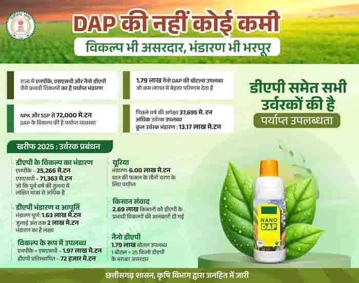 डीएपी की कमी को पूरा करने एनपीके, एसएसपी और नैनो डीएपी का भरपूर स्टॉक, राज्य में 1 लाख 79 हजार बॉटल नैनो डीएपी भंडारित, निरंतर आपूर्ति जारी