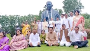 गांधी प्रतिमा के पास बैठकर प्रदर्शन करते विपक्षी सदस्य