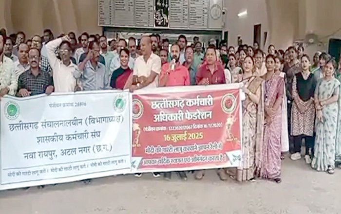 रायपुर। पिछले दो साल से अपनी मांगों को लेकर संघर्ष कर रहे छत्तीसगढ़ के सरकारी कर्मचारियों का आक्रोश आखिरकार इंद्रावती भवन में फूट पड़ा। ‘मोदी की गारंटी लागू करो’ के नारे लगाते हुए छत्तीसगढ़ कर्मचारी अधिकारी फेडरेशन के बैनर तले संचालनय कर्मचारी संघ ने आज 11 सूत्रीय मांगों को लेकर सांकेतिक हड़ताल का पहला चरण शुरू किया। फेडरेशन का कहना है कि, भाजपा सरकार ने मोदी की गारंटी के साथ सत्ता में आने के बाद कर्मचारियों से किए वादों की अब तक अनदेखी की है। फेडरेशन नेताओं ने चेतावनी दी है कि यदि सरकार मांगों पर शीघ्र निर्णय नहीं लेती, तो आंदोलन का दूसरा चरण अनिश्चितकालीन हड़ताल के रूप में शुरू किया जाएगा। कर्मचारियों ने महंगाई भत्ते में विसंगति दूर करने, पूर्व के डीए एरियर्स की राशि का समायोजन, अनियमित कर्मचारियों निका यमितीकरण, क्रमोन्नति और समयमान वेतनमान की समस्याएं व पुरानी पेंशन योजना की बहाली सहित कुल 11 मांगों को लेकर प्रदर्शन किया। कर्मचारियों ने कहा कि, सरकार की अनदेखी और वादा पूरा नहीं करने के कारण कर्मचारी लगातार उपेक्षित महसूस कर रहे हैं, अब सिर्फ आश्वासन नहीं, हमें कार्यवाही चाहिए। सरकार जल्द से जल्द हमारी मांगों को लेकर निर्णय ले।