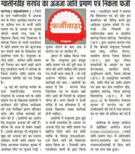 सारंगढ़। ग्रापं ग्वालिनडीह के सरपंच श्रीमती मंजूलता के खिलाफ गलत फर्जी जाति प्रमाण पत्र से चुनाव लडऩे और विजयी होने का समाचार प्रकाशित किया गया था।? समाचार की सत्यता को स्वीकार करते हुए श्रीमती मंजू लता ने अपना इस्तीफा जपं सीईओ राधेश्याम नायक को सौंप दी है जिसमें लिखा है कि मैं श्रीमती मंजूलता राज ग्रापं ग्वालिनडीह जपं सारंगढ़ का निर्वाचित सरपंच हूं। अपने पारिवारिक कारणों से अपने पद के कर्तव्यों एवं दायित्यों का निर्वहन करने में असमर्थ होने के कारण मैं अपने सरपंच पद से त्याग पत्र दे रही हूं। अत: सरपंच पद से मेरा त्याग पत्र स्वीकार करने का कृपा करें। जिसकी सूचना श्रीमती मंजूलता राज सरपंच ग्रापं ग्वालिनडीह जपं सारंगढ़ ने यह जानकारी सचिव छग राज्य अजजाति आयोग रायपुर, कलेक्टर जिला सारंगढ़- बिलाईगढ़/कोरबा, अनुवि. अधिकारी (रा.) सारंगढ़, अनुविभागीय अधिकारी (रा.) पाली जिला कोरबा, मुख्य कार्यपालन अधिकारी जपं सारंगढ़ को सूचना सरपंच ने दी है।