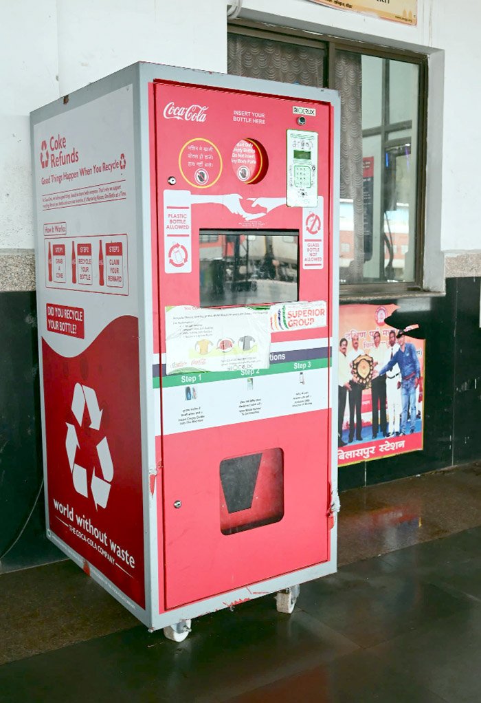 खाली प्लास्टिक बोतल मशीन में डालें। स्क्रीन पर अपना मोबाइल नंबर दर्ज करें। एसएमएस वाउचर प्राप्त कर पास के कोका कोला स्टोर से रिवार्ड पाएं। बिलासपुर स्टेशन में इन स्थानों पर उपलब्ध है बॉटल क्रशर मशीनें – लेटफार्म क्रमांक 01- वातानुकूलित प्रतीक्षालय के सामने, गेट नं 01 और 04 के पास, द्वितीय श्रेणी प्रतीक्षालय प्लेटफार्म क्रमांक 06 में स्टॉल के पास प्लेटफार्म क्रमांक 02/03 में सीढ़ी के पास