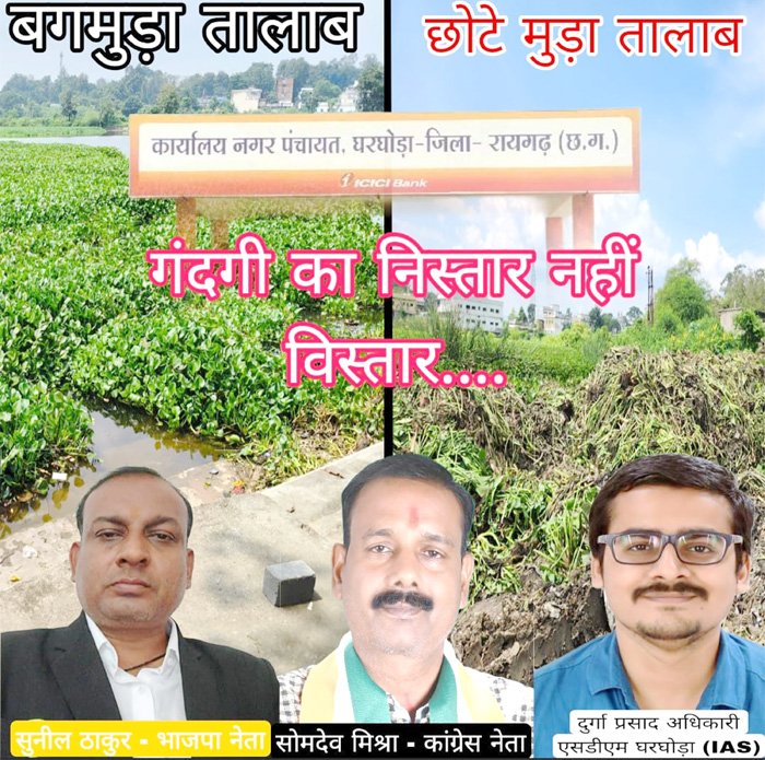 घरघोड़ा नगर पंचायत वार्ड 10 12 में दो तालाब एक दूसरे से जुड़े हुये मौजूद है जिसमें एक तरफ बगमुडा है जबकि दूसरा तालाब छोटेमुडा है। दोनों ही तालाब अगल-बगल में है। वर्तमान में त्यौहार का सीजन है, पूजा पाठ का दौर आस्था स्वरूप चल रहा है।तालाब में घट स्थापना व मूर्ति विसर्जन किया जाता है। ऐसे में यहां बड़े स्तर में यहां जलकुंभियो की मौजूदगी से तालाब बदहाली झेल रहा है। इससे कई तरह की व्यवहारिक परेशानियां लोगों को उठाना पड़ रहा है