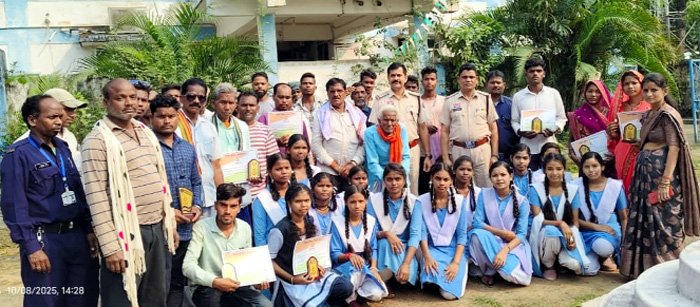 रायगढ़। पुलिस अधीक्षक श्री दिव्यांग कुमार पटेल के दिशा निर्देशन और एसडीओपी खरसिया श्री प्रभात पटेल के मार्गदर्शन पर आज दिनांक 08 अक्टूबर 2025 को थाना छाल में प्रेरणादायी पहल के तहत सम्मान समारोह आयोजित किया गया, जिसमें थाना प्रभारी निरीक्षक त्रिनाथ त्रिपाठी द्वारा क्षेत्र के मेधावी छात्राओं, पुलिसमित्रों, कोटवारों, वरिष्ठ नागरिकों और नशामुक्ति अभियान में सहयोग देने वाले नागरिकों को प्रशस्ति पत्र और प्रतीक चिन्ह भेंटकर सम्मानित किया गया। कार्यक्रम में स्थानीय जनप्रतिनिधियों, गणमान्य नागरिकों और पुलिस स्टाफ की उपस्थिति रही।