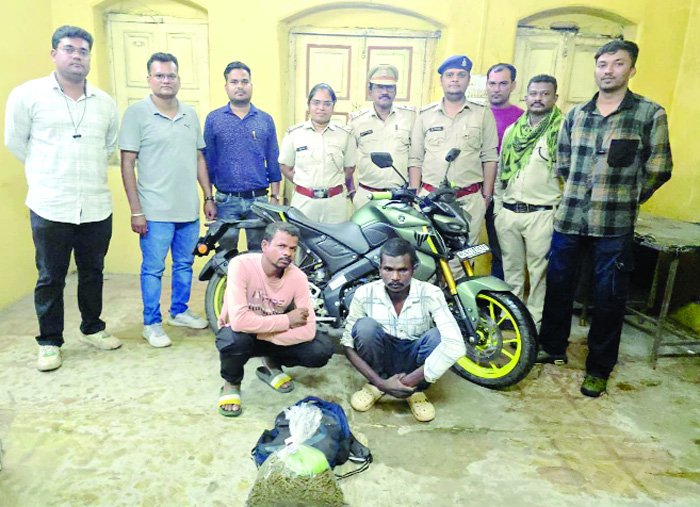 कलेक्टर मयंक चतुर्वेदी के निर्देशन और प्रभारी सहायक आयुक्त आबकारी क्रिस्टोफर खलखो के मार्गदर्शन में आबकारी विभाग की टीम ने मुखबिर से मिली सूचना के आधार पर उड़ीसा से छत्तीसगढ़ की ओर आ रही एक काले-हरे रंग की मोटरसाइकिल को घेराबंदी कर रोका। तलाशी लेने पर मोटरसाइकिल पर सवार दोनों व्यक्तियों के पास से काले रंग के पि_ू बैग में रखा भूरे-हरे रंग के प्लास्टिक पन्नी में कलीनुमा गांजा बरामद किया गया। गिरफ्तार आरोपियों में इलियास तिर्की, निवासी आमाटिकरा, थाना बांगो जिला कोरबा एवं दीपक टोप्पो, निवासी बीसबहरी, थाना बगीचा, जिला जशपुर शामिल है। दोनों आरोपियों को हिरासत में लेकर न्यायिक रिमांड पर जेल भेजने की प्रक्रिया जारी है।
