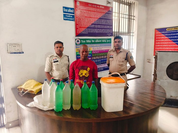 थाना प्रभारी कोतवाली निरीक्षक सुखनंदन पटेल को सूचना मिली थी कि टिकरापारा निवासी फानू उरांव अपने घर के आंगन में प्लास्टिक बोरी में रखकर कच्ची महुआ शराब बेच रहा है। सूचना पर थाना प्रभारी द्वारा टीम रवाना की गई। पुलिस टीम मौके पर पहुंची तो फानू उरांव पिता बुटिया उरांव उम्र 46 वर्ष निवासी टिकरापारा रायगढ़ अपने घर के आंगन में प्लास्टिक बोरी और थैले लेकर बैठा मिला। पूछताछ पर उसने शराब बिक्री की बात स्वीकारी, जिसके बाद उसके कब्जे से 25 लीटर हाथ भ_ी से तैयार कच्ची महुआ शराब और बिक्री रकम 230 भी बरामद की गई। आरोपी फानू उरांव का कृत्य आबकारी अधिनियम की धारा 34(2), 59(क) के तहत अपराध पाए जाने पर उसे गिरफ्तार कर न्यायिक अभिरक्षा में भेजा गया है।