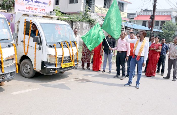 रायगढ़। शासन के निर्देशानुसार एवं कलेक्टर मयंक चतुर्वेदी के मार्गदर्शन में जिले में राष्ट्रीय पोषण माह का आयोजन 16 अक्टूबर तक किया जा रहा है। इसी क्रम में आज नगर निगम रायगढ़ के महापौर श्री जीवर्धन चौहान द्वारा पोषण रथ को हरी झंडी दिखाकर रवाना किया गया। इस अवसर पर उन्होंने कहा कि पोषण रथ आमजन को संतुलित आहार, स्वच्छता और स्वस्थ जीवनशैली के प्रति जागरूक करेगा। स्वस्थ समाज का निर्माण तभी संभव है जब हर नागरिक पोषण के महत्व को समझे।