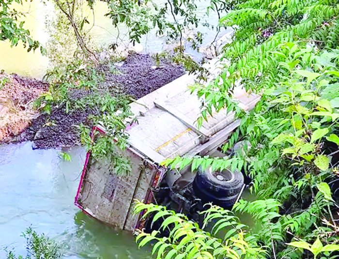 श्रीनदी में गिरी हाइवा, चालक की मौत, क्लीनर की हालत गंभीर