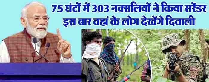 नई दिल्ली। प्रधानमंत्री नरेंद्र मोदी ने देश को नक्सलवाद से पूरी तरह मुक्त करने की गारंटी दी. पीएम मोदी ने बताया पिछले 75 घंटों में 303 नक्सलियों ने सरेंडर किया है. वे बोले पहले बस्तर माओवादी आतंकवाद का गढ़ था, आज वहां बस्तर ओलंपिक का आयोजन होता है. इस बार वहां लोग दिवाली देखेंगे.