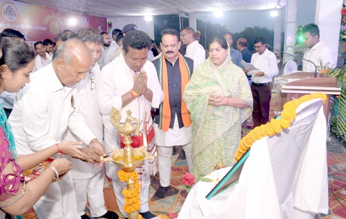 मुख्य अतिथि राठिया ने देवगुड़ी में पूजा और मांदर की थाप हाथों में लिया मुख्य अतिथि सांसद राठिया ने आदिम जाति एवं अनुसूचित जाति विकास विभाग के पंडाल में स्थापित देवगुड़ी मंदिर का पूजा अर्चना किया। साथ ही जशपुरिया नर्तक दल के मांदर को अपने हाथों से बजाकर नर्तक दल के साथ राज्योत्सव की खुशी को दोगुना किए। मुख्य अतिथि सांसद राठिया, विशिष्ट अतिथि एवं अन्य वरिष्ठ जनप्रतिनिधि एवं अधिकारियों ने छत्तीसगढ़ महतारी के समक्ष दीप प्रज्वलित कर राज्योत्सव का शुभारंभ किया। इस अवसर पर अन्य अतिथि एवं अधिकारीगण सहित बड़ी संख्या में स्कूली बच्चे ग्रामीण और शहरी उपस्थित थे।