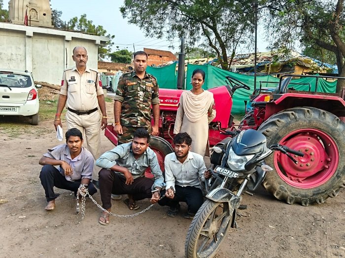 इस संबंध में मिली जानकारी के अनुसार खरसिया थाना क्षेत्र के हमलापारा निवासी प्रार्थी सौरभ अग्रवाल पिता श्यामसुंदर अग्रवाल (34 वर्ष ने रिपोर्ट दर्ज कराई थी कि उनके पास महिन्द्रा ट्रैक्टर 245 एनबीपी है, जो उनके मित्र अजय भारती (निवासी खरसिया) का है। 29 अक्टूबर की रात लगभग 8 बजे ट्रैक्टर घर के बाहर खड़ी थी, अगले दिन सुबह 6 बजे सोकर उठकर देखा तो वहां से ट्रैक्टर गायब था। जिससे काफी खोजबीन करने के बाद भी कुछ पता नहीं चलने पर उसने चोरी की रिपोर्ट खरसिया थाना में दर्ज कराया, इससे पुलिस ने अज्ञात चोरों के खिलाफ धारा-303(2) बीएनएस के तहत अपराध दर्ज कर किया था। इस दौरान पुलिस ने जांच के दौरान संदेह के आधार पर क्षेत्र के कुछ युवकों से पूछताछ की, इससे तीन युवकों ने अपराध करना स्वीकार किया, जिससे पुलिस ने आरोपी विक्रम कसेर पिता राधेश्याम कसेर (24 वर्ष), निवासी लालाधुर्वा गुडेली थाना सारंगढ़, हाल मुकाम टेमटेमा थाना खरसिया, रामप्रसाद सारथी पिता श्यामलाल सारथी (22 वर्ष) निवासी तरेकेला थाना छाल तथा कपूर कुमार केरकेट्टा पिता झगरू केरकेट्टा (31 वर्ष), निवासी कुडेकेला थाना छाल को गिरफ्तार किया है। वहीं पूछताछ में आरोपियों ने बताया कि 29 अक्टूबर की रात विक्रम कसरे की बाइक से तीनों प्रार्थी के घर पहुंचे और वहां खड़े ट्रैक्टर को चोरी कर लिए और ट्रैक्टर को मंगलबाजार के पास झाड़ी में छुपा दिया था। आरोपियों के निशानदेही पर पुलिस ने ट्रैक्टर और मोटरसाइकिल को जप्त किया है।