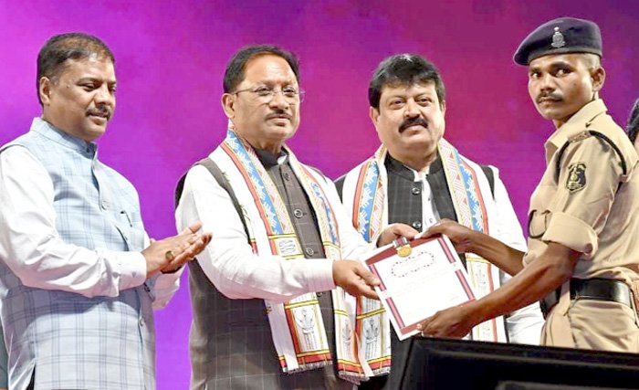 मुख्यमंत्री विष्णु देव साय ने नक्सल ऑपरेशन में अदम्य साहस और वीरता का प्रदर्शन करने वाले पुलिस के 14 जवानों को वीरता पदक प्रदान कर सम्मानित किया। उन्होंने शहीद अतिरिक्त पुलिस अधीक्षक आकाश राव गिरिपुंजे और शहीद वीरेंद्र कुमार शोरी के परिजनों सहित नक्सल मोर्चे पर जांबाजी के साथ लडऩे वाले पुलिस जवानों धरम सिंह तुलावी, विजय पुनेंग, गोपाल बरदू, रामेश्वर ओयामी, राजूलाल मरकाम, समलूराम सेठिया, तुलाराम ओवासी, मोहन लाल कट्टम, संतोष मोरामी, मनोज यादव, जामुराव तथा सुश्री निशा कचलाम को वीरता पदक प्रदान कर सम्मानित किया।