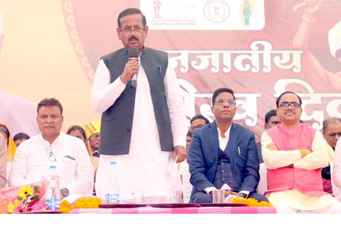 मुख्य अतिथि की आसंदी से राज्यसभा सांसद देवेंद्र प्रताप ने कहा कि – हमारे देश के आदिवासियों के इतिहास को छुपाया गया था, जिसे प्रधानमंत्री मोदी ने उजागर किया है। अंग्रेज व्यापारी बनकर आये थे, उनकी निगाह देश के जल, जंगल जमीन पर थी और जल, जंगल जमीन छीनने की कोशिश में अंग्रेजों का पहली लड़ाई आदिवासियों के साथ हुआ था। छत्तीसगढ़ में सभी रियासत आदिवासियों की थी। आज से 150 साल पहले झारखण्ड क्षेत्र में बिरसा मुंडा ने जन्म लिया, उन्होंने अपनी शिक्षा के दौरान ईसाई धर्म से संचालित स्कूल के मिशनरी शिक्षा और संस्कृति को त्यागकर जनजाति परम्परा, बैगा पुजारी से मुलाक़ात किया तो मिशनरी के द्वारा किए जा रहे धर्म परिवर्तन का पता चला। बिरसा मुंडा ने अंग्रेजों से लड़ा, जिसके कारण उन्हें रांची के जेल में उन्हें रखा गया और जहर देने के कारण उनकी मृत्यु हुई।