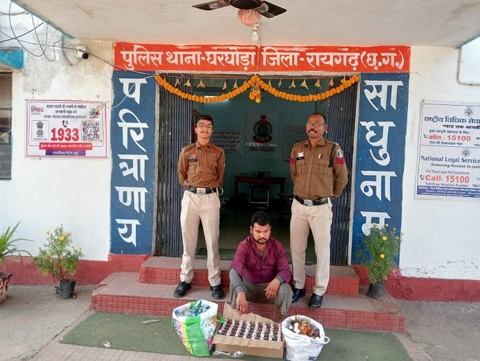 पुलिस को मुखबिर से सूचना मिली थी कि रायकेरा निवासी रूपेश बेहरा अपने घर में अवैध रूप से अंग्रेजी व देशी शराब बिक्री के लिए संग्रहीत कर रखा है। सूचना की तस्दीक पर की गई रेड कार्रवाई में आरोपी रूपेश बेहरा पिता जिकर लाल बेहरा (35 वर्ष) निवासी रायकेरा के घर से गोवा स्पेशल अंग्रेजी शराब के 48 पाव, मैकडावल नंबर 1 के 20 पाव, ग्रीन लेवल के 7 पाव, बैगपाइपर के 4 पाव, कुल 79 पाव अंग्रेजी शराब जिसकी कीमत 11,720 रुपये तथा 66 पाव देसी प्लेन शराब जिसकी कीमत 5,280 रुपये को मिलाकर कुल 145 पाव (26 लीटर 100 एमएल) अवैध शराब (17 हजार रूपये) बरामद की गई। इसके अलावा शराब बिक्री की 2,000 रुपये नगद रकम भी जब्त की गई। आरोपी द्वारा अवैध रूप से शराब रखकर बिक्री करना पाया जाने पर थाना घरघोड़ा में धारा 34(2), 34(ख) आबकारी अधिनियम के तहत अभियोग पंजीबद्ध किया गया है।