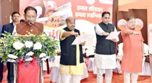 रायपुर। मुख्यमंत्री श्री विष्णु देव साय आज 75वें संविधान दिवस के अवसर पर राजधानी रायपुर स्थित टाउन हॉल में आयोजित ‘हमारा संविधान, हमारा स्वाभिमान’ कार्यक्रम में शामिल हुए। मुख्यमंत्री श्री साय ने उपस्थित जनसमूह के साथ संविधान की प्रस्तावना का सामूहिक वाचन किया और संविधान के प्रति अपनी निष्ठा व्यक्त की। इस दौरान मुख्यमंत्री ने संविधान दिवस पर आयोजित प्रदर्शनी का अवलोकन किया। उन्होंने संविधान पर आधारित लघु फिल्म भी देखी और जनप्रतिनिधियों के साथ इस अवसर को यादगार बनाने के लिए सेल्फी ली।