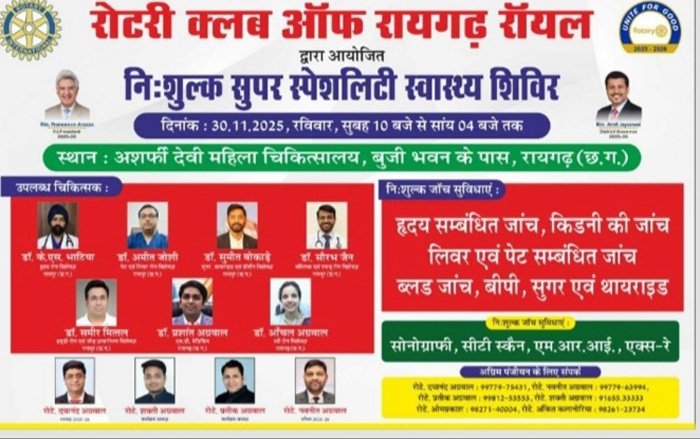 रायगढ़। रोटरी क्लब ऑफ़ रायगढ़ रॉयल द्वारा आमजन के स्वास्थ्य को ध्यान में रखते हुए नि:शुल्क सुपर स्पेशलिटी स्वास्थ्य शिविर का आयोजन आगामी 30 नवम्बर रविवार, को किया जा रहा है। यह शिविर सुबह 10 बजे से शाम 4 बजे तक अशर्फी देवी महिला चिकित्सालय, बृज भवन के पास, रायगढ़ में आयोजित होगा।