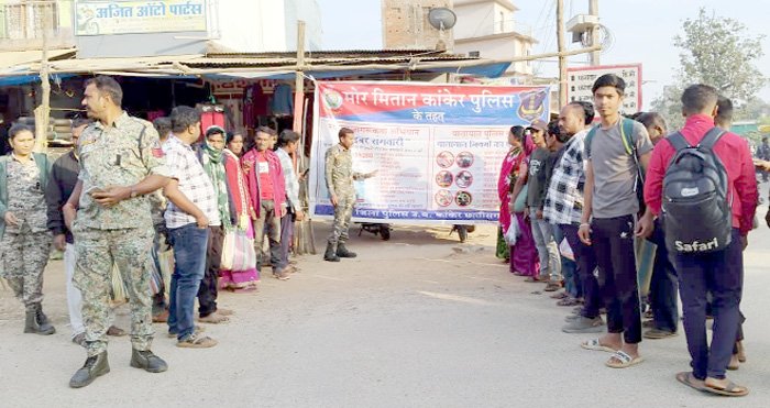 पखांजुर। मोर मितान कांकेर पुलिस के तहत बांदे साप्ताहिक बाजार में बांदे पुलिस के द्वारा साइबर जागरूकता अभियान और यातयात नियमों के बारे में बाजार चौक में आम लोगो को जानकारी दी गई, इस दौरान आम जनताओं ने बड़ी उत्सुकता से जानकारी लेते दिखाई दी। यातायात नियम जैसे गाड़ी चलाते समय हमेशा सीट बेल्ट पहने,एवं स्पीड लिमिट के भीतर ड्राइव करें, वाहन से आगे सुरक्षित दुरी रखें,शारब पी कर गाड़ी न चलाएं. वाहन धीमे चलाएं अपना कीमती जीवन बचांए.वाहन चलाते समय मोबाईल पर ध्यान न दे एवं मोबाईल का इस्तेमाल न करे,बाच्चो को सडक़ पर खेलने ना दे,हमेशा हेलमेट का उपयोग करे।