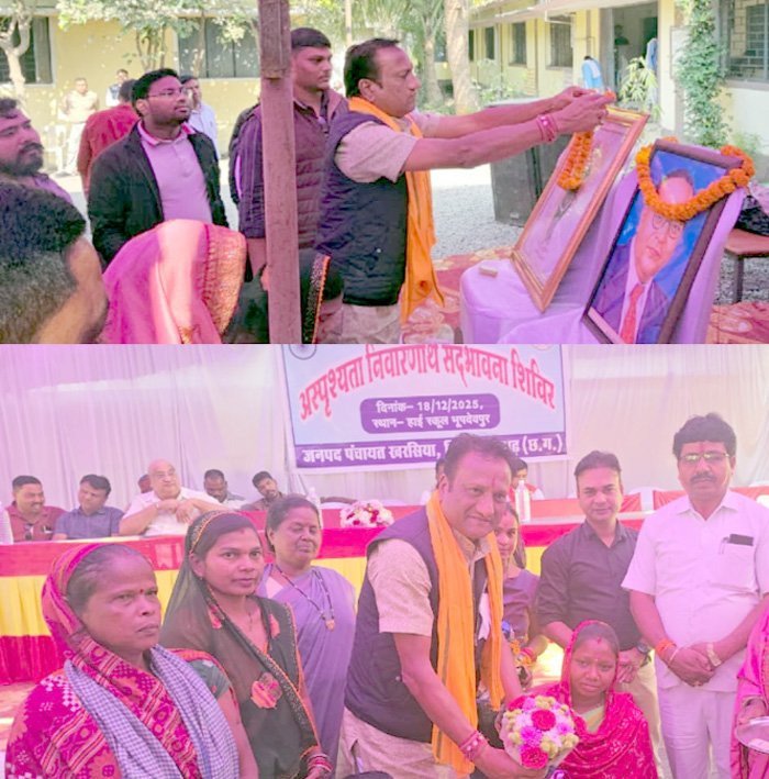 खरसिया। अनुसूचित जातियों को समाज में समान दर्जा दिलाने एवं समाज में अस्पृश्यता की भावना को दूर करने के उद्देश्य से ‘अस्पृश्यता निवारणार्थ सद्भावना शिविर’ का आयोजन खरसीया जनपद पंचायत द्वारा अनुसूचित जाति बाहुल्य क्षेत्र भूदेवपुर के हाईस्कूल में गुरु घासीदास बाबा की जयंती के शुभ अवसर पर आयोजित किया गया। आज के इस कार्यक्रम में नगर पालिका अध्यक्ष कमल गर्ग, छाया विधायक महेश साहू, जनपद पंचायत उपाध्यक्ष डॉ हितेश गवेल, बीडीसी श्रीमती सरिता चौहान, सरपंच श्रीमती गीता राठिया, श्रीमती लक्ष्मी सिदार, कान्हा राठिया, विद्याधर राठिया, राधे राठौर पार्षद, खरसिया नगर मंडल अध्यक्ष विजय शर्मा, चपले मंडल अध्यक्ष पवन पटेल, सुरेन्द्र चौहान, लक्ष्मी पटेल, शिवचरण महिष, सौरभ अग्रवाल, कैलाश शर्मा, हर्ष अग्रवाल, नीलेश ठाकुर, दिनेश नायडू, छोटू गवेल, खेम साहू, मोहन मित्तल, चन्द्रशेखर पटेल, प्रदीप पटेल, छेदी राठिया सरपंच प्रतिनिधि, मुख्य कार्यपालन अधिकारी खरसिया पवन पटेल, अर्जनपद के सभी कर्मचारी हाईस्कूल भूपदेवपुर के शिक्षक शिक्षिकाओं और छात्र छात्राओं की गरिमामय उपस्थिति में यह कार्यक्रम आयोजित किया गया। कार्यक्रम के प्रारंभ में छत्तीसगढ़ महतारी और बाबा साहब भीमराव अंबेडकर के चित्रों के समक्ष दीप प्रज्वलित कर और माल्यार्पण के साथ छत्तीसगढ़ के राज्यगीत का गायन और अतिथियों का स्वागत गीत छात्राओं द्वारा किया गया। इस अवसर पर नगर पालिका अध्यक्ष कमल गर्ग ने कहा कि अंग्रेजों और मुगलों ने इस देश पर राज करते हुए सभी संप्रदायों में फूट डालने और वेमनस्य पैदा करने का कार्य किया आने वाले समय में हमें एकजुट होकर अस्पृश्यता की बुराई को दूर करना होगा गुरु घासीदास बाबा ने भी कहा है कि मनखे मनखे एक समान और भगवान ने हम सभी इंसानों को एक जैसा बनाया है हमारे रगों में एक जैसा खून है जरूरत पडऩे पर यही खून सभी जाति में एक समान काम आता है अंत्योदय के प्रणेता पंडित दीनदयाल उपाध्याय ने भी समाज के अंतिम छोर में खड़े व्यक्ति को भी समान अवसर उपलब्ध करवाने की बात कही है आने वाले समय में हमें एकजुट होकर आगे बढऩे की आवश्यकता है। सबका साथ सबका विकास करने वाले देश के यशस्वी प्रधानमंत्री श्री नरेंद्र मोदी जी के विजन 2047 विकसित भारत को साकार करना है। इस अवसर पर छात्र छात्राओं के लिए भाषण प्रतियोगिता रंगोली प्रतियोगिता निबंध प्रतियोगिता का आयोजन किया गया।