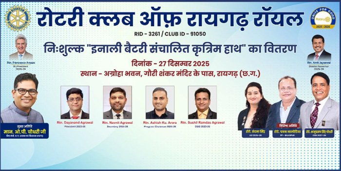 रायगढ़। समाज सेवा के क्षेत्र में निरंतर सक्रिय रोटरी क्लब ऑफ़ रायगढ़ रॉयल द्वारा जरूरतमंद दिव्यांगजनों के लिए नि:शुल्क ‘इनाली बैटरी संचालित कृत्रिम हाथ’ वितरण कार्यक्रम का आयोजन किया जा रहा है। यह सेवा कार्यक्रम 27 दिसंबर 2025 को अरोहा भवन, जोरी शंकर मंदिर के पास, रायगढ़ (छत्तीसगढ़) में आयोजित होगा। वहीं इस महत्वपूर्ण कार्यक्रम के मुख्य अतिथि छत्तीसगढ़ शासन के मंत्री एवं विधायक माननीय ओ.पी. चौधरी होंगे, जो इस पुनीत सेवा कार्य का शुभारंभ करेंगे व विशिष्ट अतिथि एवं गणमान्य अतिथि रोटेरियन पवन नालोटिया (पूर्व अध्यक्ष, बिलासपुर) उपस्थित रहेंगे। साथ ही इस अवसर पर रोटेरियन सुशील रामदास अग्रवाल (ष्ठस्त्र 2025-26)रोटेरियन वंदना सिंह (एजी-2025-26) रोटेरियन भानू प्रताप सिंह चौधरी (डीजीई 2027-28) भी अपनी गरिमामयी उपस्थिति दर्ज कराएँगे। तकनीक आधारित कृत्रिम हाथ से मिलेगा नया आत्मविश्वास–रोटरी क्लब के अध्यक्ष रोटेरियन दयानंद अग्रवाल ने बताया कि बैटरी संचालित कृत्रिम हाथ आधुनिक तकनीक से निर्मित है, जिससे लाभार्थियों को दैनिक कार्यों में काफी सहूलियत मिलेगी और उनका आत्मविश्वास बढ़ेगा। सचिव रोटेरियन नवनीत अग्रवाल ने कहा कि रोटरी क्लब द्वारा समय-समय पर जन-सेवा एवं स्वास्थ्य संबंधी कार्यक्रम आयोजित किए जाते रहे हैं। यह आयोजन दिव्यांगजनों के जीवन में सकारात्मक परिवर्तन लाने की दिशा में एक महत्वपूर्ण कदम है। कार्यक्रम के चेयरमैन रोटेरियन आशिष कुमार अरोड़ा ने बताया कि पंजीकरण और परीक्षण के बाद पात्र लाभार्थियों को कृत्रिम हाथ प्रदान किए जाएंगे। रोटरी क्लब ऑफ़ रायगढ़ रॉयल वर्षों से स्वास्थ्य, शिक्षा और सामाजिक कल्याण के क्षेत्र में सक्रिय भूमिका निभाता आ रहा है। कृत्रिम हाथ वितरण कार्यक्रम भी क्लब की इसी सामाजिक प्रतिबद्धता का उत्कृष्ट उदाहरण है। क्लब ने शहर एवं आसपास के क्षेत्रों के ऐसे सभी जरूरतमंद लाभार्थियों से अपील की है कि वे निर्धारित तिथि को समय पर पहुँचकर इस सेवा का लाभ अवश्य उठाएँ।