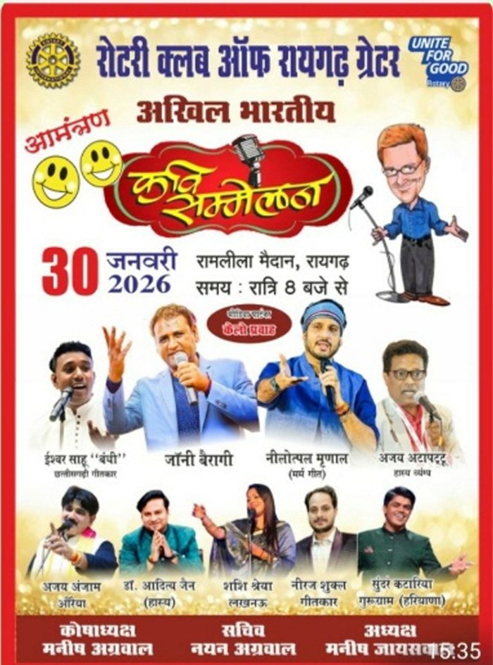 रायगढ़। शहर की अग्रणी सुप्रसिद्ध सामाजिक संस्था रोटरी क्लब ऑफ रायगढ़ ग्रेटर की पहल से हर वर्ष रायगढ़ क्लब संस्थापक रोटेरियन पुरुषोत्तम अग्रवाल संजीवनी व क्लब सदस्यों की पहल से बड़ी भव्यता के साथ राष्ट्रभाषा हिंदी के प्रचार प्रसार के उद्देश्य से अखिल भारतीय कवि सम्मेलन का भव्य आयोजन किया जाता है।वहीं इस बार भी क्लब अध्यक्ष मनीष जायसवाल, सचिव नयन अग्रवाल, कोषाध्यक्ष मनीष अग्रवाल के विशेष मार्गदर्शन में आज 30 जनवरी को शहर के रामलीला मैदान में रात 8 बजे से नि:शुल्क अखिल भारतीय कवि सम्मेलन का आयोजन किया जा रहा है।