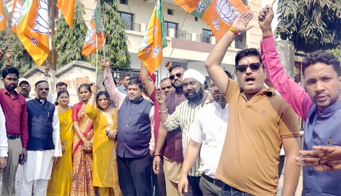 बजट पेश होते ही भाजपा कार्यालय में जश्न आतिशबाजी व मिठाई वितरण