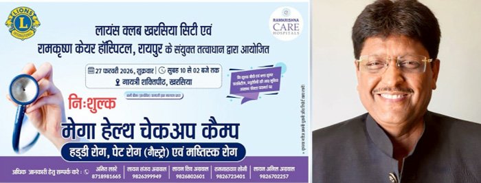 रायगढ़। 27 फरवरी 2026, शुक्रवार सुबह 10 से 02 बजे तक गायत्री शक्तिपीठ खरसिया में लायंस क्लब खरसीया एवं रामकृष्ण केयर हॉस्पिटल रायपुर के संयुक्त तत्वाधान में मेगाहेल्थ गेम का आयोजन किया जा रहा है जिसमें नि:शुल्क बीपी एवं ब्लड शुगर डायबिटीज, न्यूरोपैथी, हड्डी रोग, पेट रोग (गैस्ट्रो) एवं मष्तिस्क रोग की जांच सुविधा एवं परामर्श जांच के लिए स्पेशलिस्ट डॉक्टर परामर्श के लिये उपलब्ध रहेंगे। इस संबंध में लायंस क्लब अध्यक्ष लायन संजय अग्रवाल ने बताया कि आगामी 27 फरवरी को गायत्री शक्तिपीठ खरसिया में लायंस क्लब सिटी खरसीया एवं रामकृष्ण केयर हॉस्पिटल रायपुर के सौजन्य से आयोजित किया जा रहा है जिसमें विशेषज्ञ डाक्टरों की टीम जिनमें मुख्य रूप से डॉ उमेश चंद्रा न्यूरो फिजीशियन, डॉ प्रतीक ढाबलिया ऑर्थो, डॉ संतोष चावला गैस्ट्रिक, लिवर उपलब्ध रहेंगे जो मरीजों की नि:शुल्क जांच कर परामर्श प्रदान करेंगे। आसपास के सभी क्षेत्रवासियों से ग्रामीण जनों से लायंस क्लब खरसिया का अनुरोध है कि वह इस मेगा हेल्थ कैंप में पहुँचकर अपनी बीमारियों का इलाज करवाकर लाभ प्राप्त करें। मेगा हेल्थ चेकअप कैम्प की अधिक जानकारी हेतु- अमित लहरे 8718981665, लायन संजय अग्रवाल 9826399949, लायन शिव अग्रवाल 9826802601, राम रामनारायण सोनी 9826723401, लायन अनिल अग्रवाल 9826702257 से संपर्क करें।
