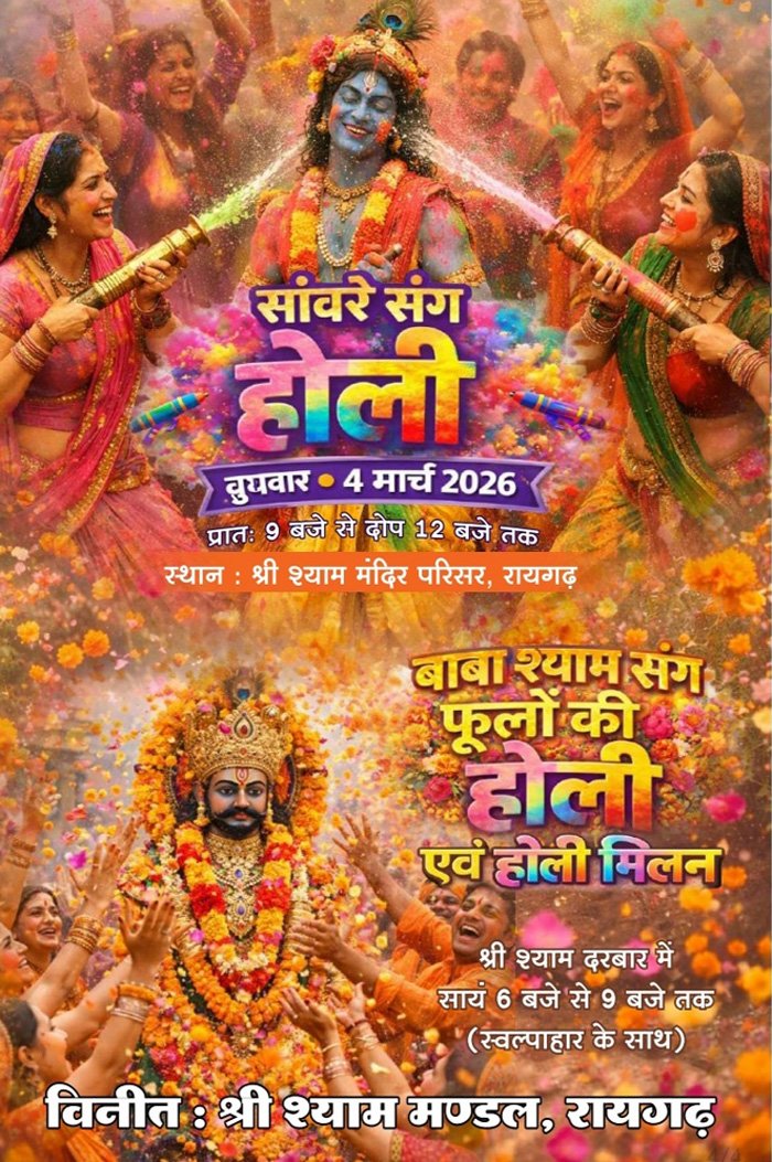 रंग रंगीला महोत्सव के तृतीय भव्य धार्मिक आयोजन के अंतर्गत आगामी 4 मार्च को प्रभु श्री श्याम बाबा की पूजा अर्चना के पश्चात सुबह 9 बजे से दोपहर बारह बजे तक बाबा श्याम संग-रंग ओर ग़ुलाल की यादगार होली खेली जाएगी। जिसमें सभी श्याम प्रेमी शामिल होंगे। इसी तरह शाम को 5 बजे से रात 9 बजे तक श्री श्याम दरबार में भक्तो द्वारा बाबा संग फूलो की होली खेली जाएगी एवं स्वल्पाहार के साथ बड़ी आत्मीयता के साथ यादगार होली मिलन समारोह का आयोजन होगा।