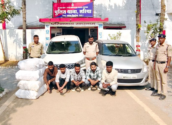 सारंगढ़। पुलिस अधीक्षक आंजनेय वार्ष्णेय के द्वारा जिले के सभी थाना/चौकी प्रभारियों को जुआ, सट्टा, शराब, अवैध मादक पदार्थ गांजा में संलिप्त व्यक्तियों पर कड़ी कार्यवाही करने हेतु निर्देशित करने पर अति0 पुलिस अधीक्षक श्रीमती निमिषा पाण्डेय एवं उपपुलिस अधीक्षक सुश्री संतोषी ग्रेस के मार्गदर्शन में थाना प्रभारी प्रमोद यादव के कुशल नेतृत्व मे सरिया पुलिस को 125 किलो 7 ग्राम अवैध मादक पदार्थ गांजा के साथ 5 आरोपी को गिरफ्तार करने में सफलता प्राप्त हुई है। विवरण है कि 19 मार्च 26 को पेट्रोलिंग के दौरान मुखबीर सुचना मिला कि – एक सफेद रंग की आर्टिगा कार क्रमांक एमपी20 सीएम 7737 में कुछ व्यक्ति उड़ीसा से गांजा ले कर शहडोल जाने वाले है तथा उसके आगे- आगे एक स्विफ्ट कार क्रमांक एमपी 62 सी 1080 पायलेटिंग में चल रही है, सूचना पर भुलुमुडा – सरिया मेन रोड मे घेराबंदी कर दोनों कार को पकड़ा गया। आर्टिगा कार चालक से नाम पता पूछने पर अपना नाम पूर्णानंद सिंह उर्फ राहुल पिता दिगंबर उम्र 34 वर्ष सा पांडव नगर शहडोल जिला शहडोल मप्र का होना बताया। गवाहों के समक्ष आर्टिगा कार की तलाशी लेने पर कार के अंदर 120 पैकेट में कुल 125 किलो 07 ग्राम अवैध मादक पदार्थ गांजा मिला।