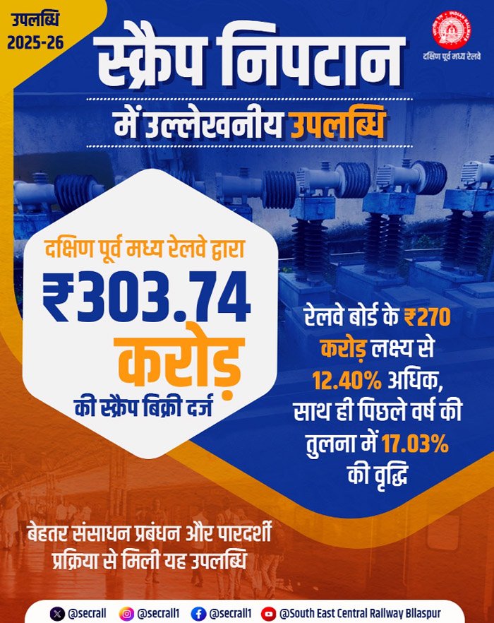 बिलासपुर। दक्षिण पूर्व मध्य रेलवे ने वित्तीय वर्ष 2025-26 में ‘मिशन जीरो स्क्रैप’ के अंतर्गत उल्लेखनीय उपलब्धि हासिल करते हुए स्क्रैप के निपटान से रू. 303.74 करोड़ का राजस्व अर्जित किया है। यह उपलब्धि रेलवे के इतिहास में दूसरी सबसे बड़ी स्क्रैप बिक्री है। उल्लेखनीय है कि यह आय रेलवे बोर्ड द्वारा निर्धारित रू. 270 करोड़ के वार्षिक लक्ष्य से 12.4 प्रतिशत अधिक है, जो संगठन की कुशल कार्यप्रणाली, प्रभावी योजना एवं पारदर्शी क्रियान्वयन को दर्शाता है। यह सफलता विभिन्न कार्य स्थलों एवं ट्रैक किनारे पड़े स्क्रैप की सुनियोजित पहचान, उसके व्यवस्थित एकत्रीकरण तथा ई-नीलामी के माध्यम से प्राप्त की गई है। इस पहल से न केवल राजस्व में वृद्धि हुई है, बल्कि रेलवे परिसरों की स्वच्छता एवं सुव्यवस्था में भी उल्लेखनीय सुधार हुआ है। स्क्रैप बिक्री के मद-वार विवरण में रेल से रू. 114.96 करोड़, पी.वे. आइटम से रू. 16.53 करोड़, रोलिंग स्टॉक्स से ?32.53 करोड़, नॉन-फेरस सामग्री से ?25.63 करोड़, पीएससी स्लीपर से रू.8.39 करोड़ तथा अन्य मदों से रू. 105.43 करोड़ की आय अर्जित की गई है। इसके साथ ही, भारत सरकार की नीतियों के अनुरूप दक्षिण पूर्व मध्य रेलवे द्वारा गवर्नमेंट ई-मार्केटप्लेस (जीईएम) के माध्यम से खरीद में भी उल्लेखनीय वृद्धि दर्ज की गई है। वित्तीय वर्ष 2025-26 में त्रद्गरू के माध्यम से रू. 397.83 करोड़ की खरीद की गई, जो पिछले वित्तीय वर्ष 2024-25 की तुलना में 37.80 प्रतिशत अधिक है। दक्षिण पूर्व मध्य रेलवे की यह उपलब्धि केवल आर्थिक प्रगति तक सीमित नहीं है, बल्कि यह संगठन की दूरदर्शिता, पारदर्शिता, संसाधनों के कुशल प्रबंधन एवं सतत विकास के प्रति प्रतिबद्धता का सशक्त उदाहरण है। यह सफलता भविष्य में और भी उच्च मानदंड स्थापित करने के लिए प्रेरणा प्रदान करती है।