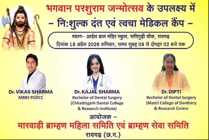 रायगढ़। भगवान परशुराम जन्मोत्सव की खुशी में  मारवाड़ी ब्राह्मण महिला समिति एवं ब्राह्मण सेवा समिति की विशेष पहल से आज 18 अप्रैल को बाल मंदिर परिसर में नि:शुल्क दंत एवं त्वचा मेडिकल कैंप का आयोजन किया जा रहा है। वहीं इस संबंध में विस्तृत जानकारी देते हुए ब्राह्मण महिला समिति अध्यक्ष श्रीमती मीरा विजय वीरभान शर्मा व ब्राह्मण सेवा समिति अध्यक्ष प्रवीण शर्मा ने बताया कि सांस्कृतिक कार्यक्रम के अतिरिक्त समाज सेवा कार्य को तरजीह देते हुए साथ लोगों को स्वास्थ्य के प्रति जागरूक करने के उद्देश्य से नि:शुल्क मेडिकल कैंप का आयोजन 18 अप्रैल को सुबह नौ बजे से दोपहर दो बजे तक किया जाएगा और इस मेडिकल कैंप शिविर में अनुभवी डॉक्टर डॉ. विकास शर्मा डॉ. काजल शर्मा, डॉ. दीप्ति द्वारा नि:शुल्क जांच एवं परामर्श दिया जाएगा। समिति ने शहरवासियों से अपील की है कि इस अवसर का अधिक से अधिक लाभ उठाएं और अपने स्वास्थ्य की जांच अवश्य कराएं।