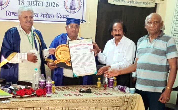रायगढ़। खरसिया नगर पालिका में निवासरत लोकप्रिय कर्मठ शिक्षा विभाग छत्तीसगढ़ शासन में लंबी सेवा दे चुके श्रीराधेश्याम शर्मा को सेवानिवृत्ति उपरांत हिंदी भाषा एवं साहित्य में डॉक्टरेट की उपाधि से नवाजा गया। यह मानद उपाधि इतिहास एवं पुरातत्व शोध संस्थान बालाघाट मध्य प्रदेश के पुरातत्व कार्यालय में आयोजित दो दिवसीय कार्यक्रम के अंतर्गत 18 अप्रैल 2026 को राष्ट्रीय अध्यक्ष वीरेंद्र गहरवार इतिहास एवं पुरातत्व शोध भारत कैंप बालाघाट द्वारा अधिक अधिक संख्या में उपस्थित लोगों के बीच प्रदान किया गया।