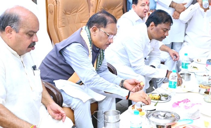 NavinKadam > रायपुर > सीएम साय ने भाजपा कार्यकर्ताओं को खिलाई भजिया और पताल की चटनी
