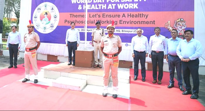 बिलासपुर। 28 अप्रैल को एसईसीएल मुख्यालय प्रांगण में ‘विश्व कार्यस्थल सुरक्षा एवं स्वास्थ्य दिवस- 2026’ के अवसर पर गरिमामय कार्यक्रम का आयोजन किया गया। इस वर्ष विश्व कार्यस्थल सुरक्षा एवं स्वास्थ्य दिवस- 2026 की थीम आइए एक स्वस्थ मनो सामाजिक कार्य वातावरण सुनिश्चित करें है। कार्यक्रम की शुरुआत अध्यक्ष सह प्रबंध निदेशक श्री हरीश दुहन दवारा निदेशक (तकनीकी संचालन) एन फ्रेंकलिन जयकुमार, निदेशक (मानव संसाधन) श्री बिरंची दास, निदेशक (वित्त) डी. सुनील कुमार, मुख्य सतर्कता अधिकारी हिमांशु जैन, निदेशक तकनीकी (योजना-परियोजना) श्री रमेश चन्द्र महापात्र, विभीन्न विभागाध्यक्षों, श्रम संघ प्रतिनिधियों, अधिकारियों-कर्मचारियों की उपस्थिति में सुरक्षा ध्वज फहराकर की गई। इस अवसर पर मुख्य अतिथि, विशिष्ट अतिथियों, विभीन्न विभागाध्यक्षों, श्रम संघ प्रतिनिधियों ने ने मुख्यालय परिसर स्थित श्रमिक प्रतिमा पर माल्यार्पण किया।