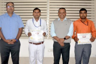 संरक्षा के दो सजग प्रहरियों को मंडल रेल प्रबंधक पाण्डेय ने किया सम्मानित