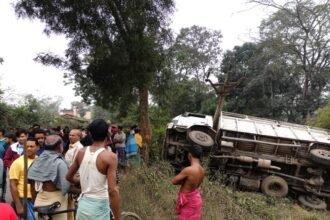 अनियंत्रित ट्रक 11 केवी बिजली खंबे से टकरा कर पलटी, बाल बाल बचा ड्राइवर