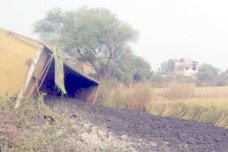 जर्जर सडक़ के चलते खेत पलटा कोयला लोड टे्रलर