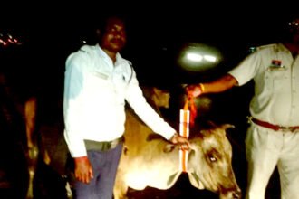 हाईवे पर घुमंते मवेशियों के गले में लगाई जा रही रेडियम पट्टी