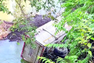 श्रीनदी में गिरी हाइवा, चालक की मौत, क्लीनर की हालत गंभीर