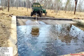 वन्य प्राणियों के पेयजल व्यवस्था के लिए सासर में टैंकर से पानी भर रहा वन विभाग