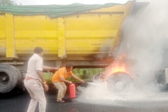 एनएच- 49 पर कोयला लोड़ ट्रेलर में लगी आग