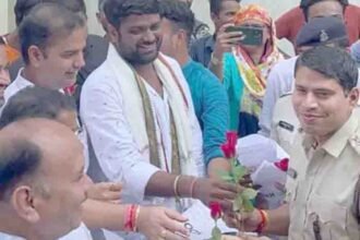 एनएसयूआई ने डीएसपी को दिया गुलाब का फूल